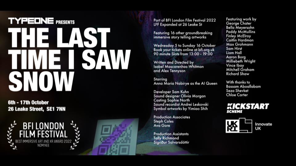 Played by Anna-Maria Nabirye, the Snow Queen Interactive at LFFE was a hybrid machine learning and voice acted babbling artificial intelligence, lost in a vortex of infinite thoughts and desperately searching for someone or something.